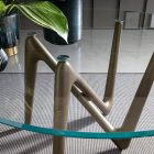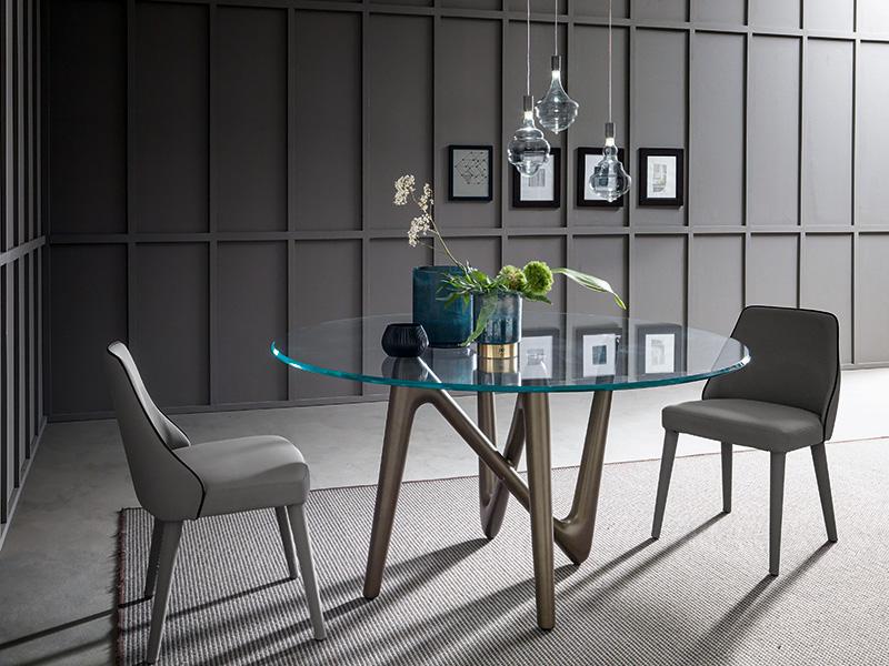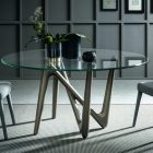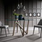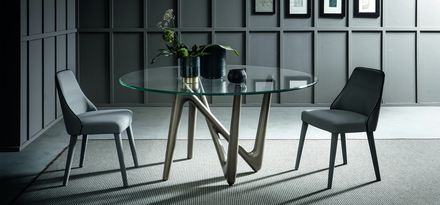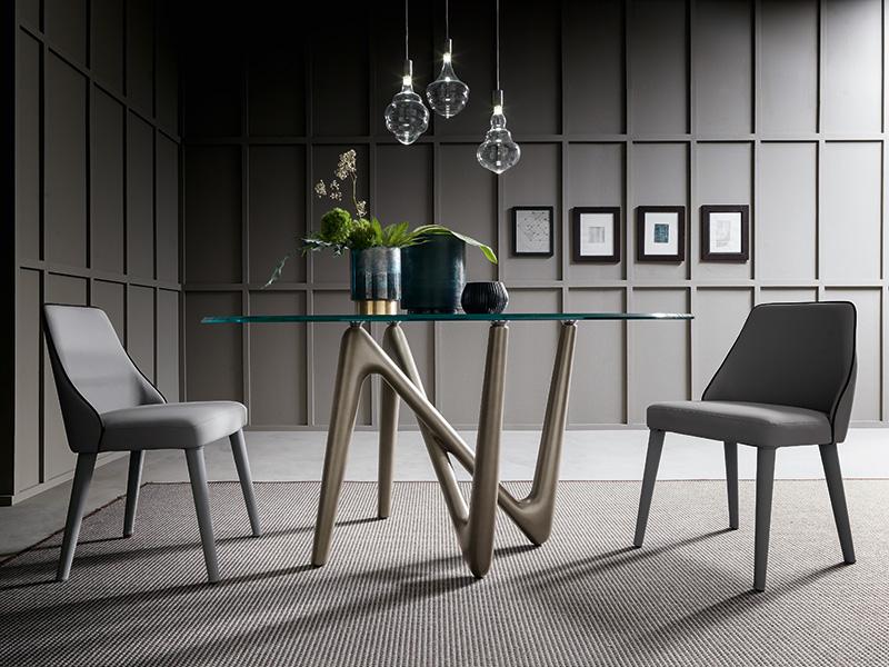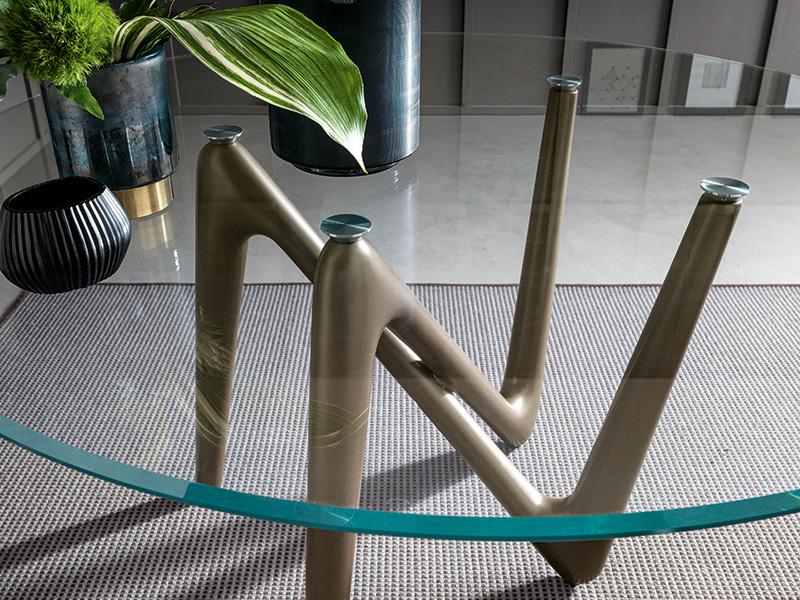 Il piano in vetro, con la sua trasparenza eterea, sembra sospeso nello spazio, poggiando delicatamente su quattro punti di appoggio che fungono da punti cardinali visivi, guidando lo sguardo e amplificando la percezione della struttura sottostante. Questa soluzione progettuale non solo enfatizza l’equilibrio tra solidità e leggerezza, ma dona al tavolo una presenza scenica unica, facendolo apparire quasi in movimento, come se fosse un’opera d’arte in continua evoluzione.