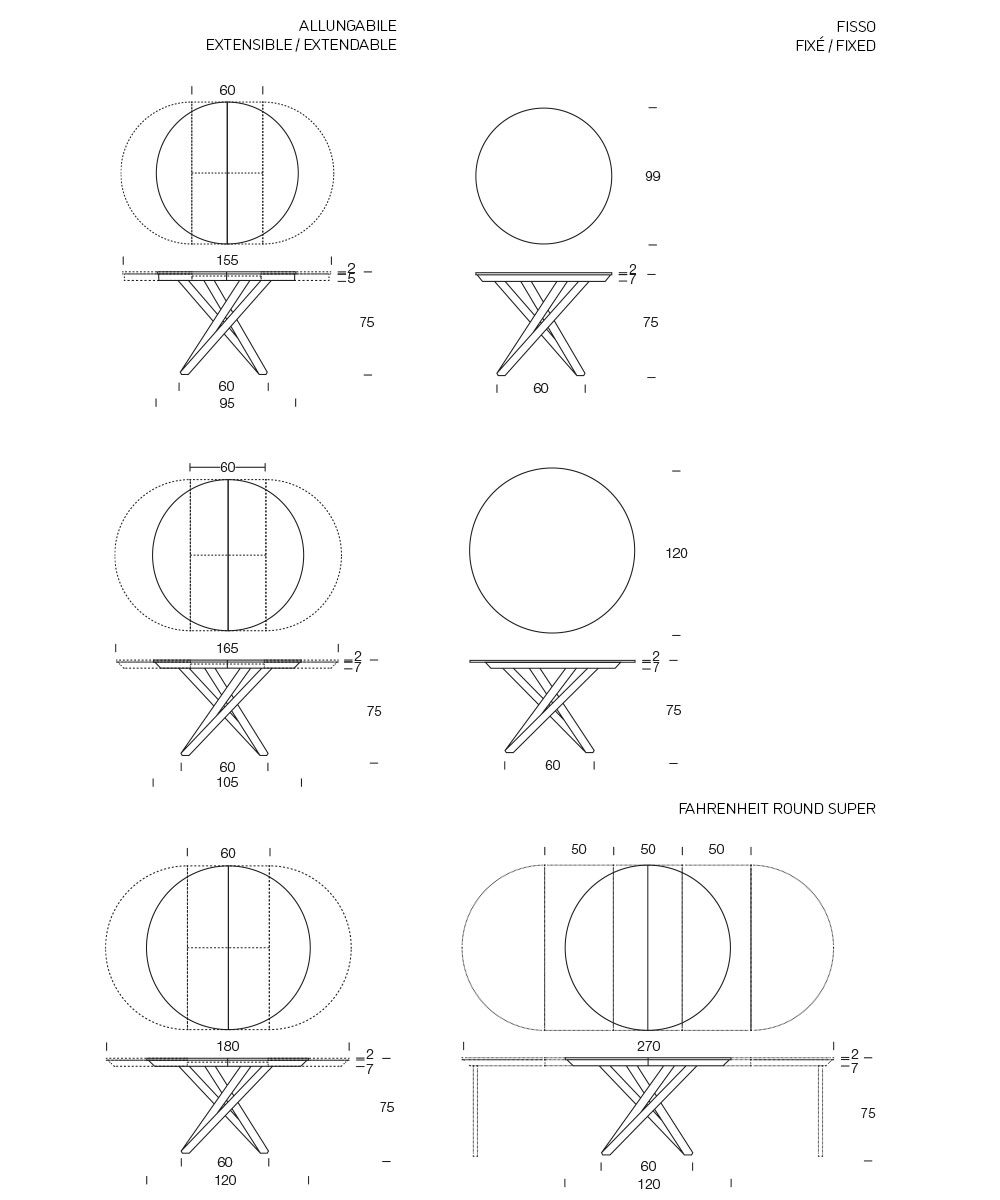 IL TAVOLO CIRCOLARE FAHRENHEIT 120 (120X180) SI ALLUNGA E DIVENTA OVALE SENZA PERDERE IL SUO FASCINO. LO SPESSORE INCLINATO SOTTO AL PIANO FA SCIVOLARE LO SGUARDO VERSO IL SOSTEGNO CENTRACHE CON UN EFFETTO DINAMICO ARREDA SPAZI IN CONTINUA EVOLUZIONE.DIMENSIONI CHIUSO DIAM. CM 120 ( APERTO 120 X 180 ) ALTEZZA CM 75