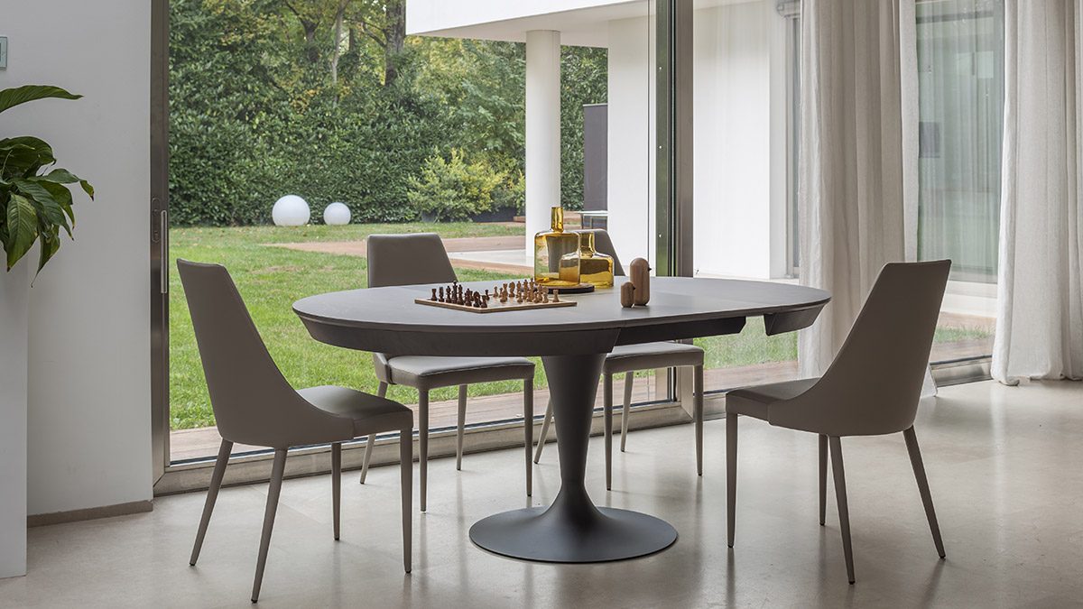 TAVOLO SUN ROTONTO ALLUNGABILE NELLA SUA FORMA A CALICE, EVOCA UNA COPPA DI CHAMPAGNE. IL TAVOLO SUN ROTONTO ALLUNGABILE IN EFFETTI QUESTO TAVOLO HA TUTTA L’ARIA DI VOLER FESTEGGIARE IL CONNUBIO VINCENTE TRA RAFFINATEZZA E SINUOSITÀ DI UN DESIGN EVOLUTO E LA RICERCATEZZA DEL MATERIALE DEL PIANO IN CERAMICA PIETRA GREY OPACA. IL TAVOLO SUN ROTONTO ALLUNGABILE DOMINA AL CENTRO DELLA SALA, ACCOGLIENTE NELLA SUA ROTONDITÀ, DIVENTA ELLITTICO PER OFFRIRSI NELLE SUE PERFORMACES DIMENSIONALI.